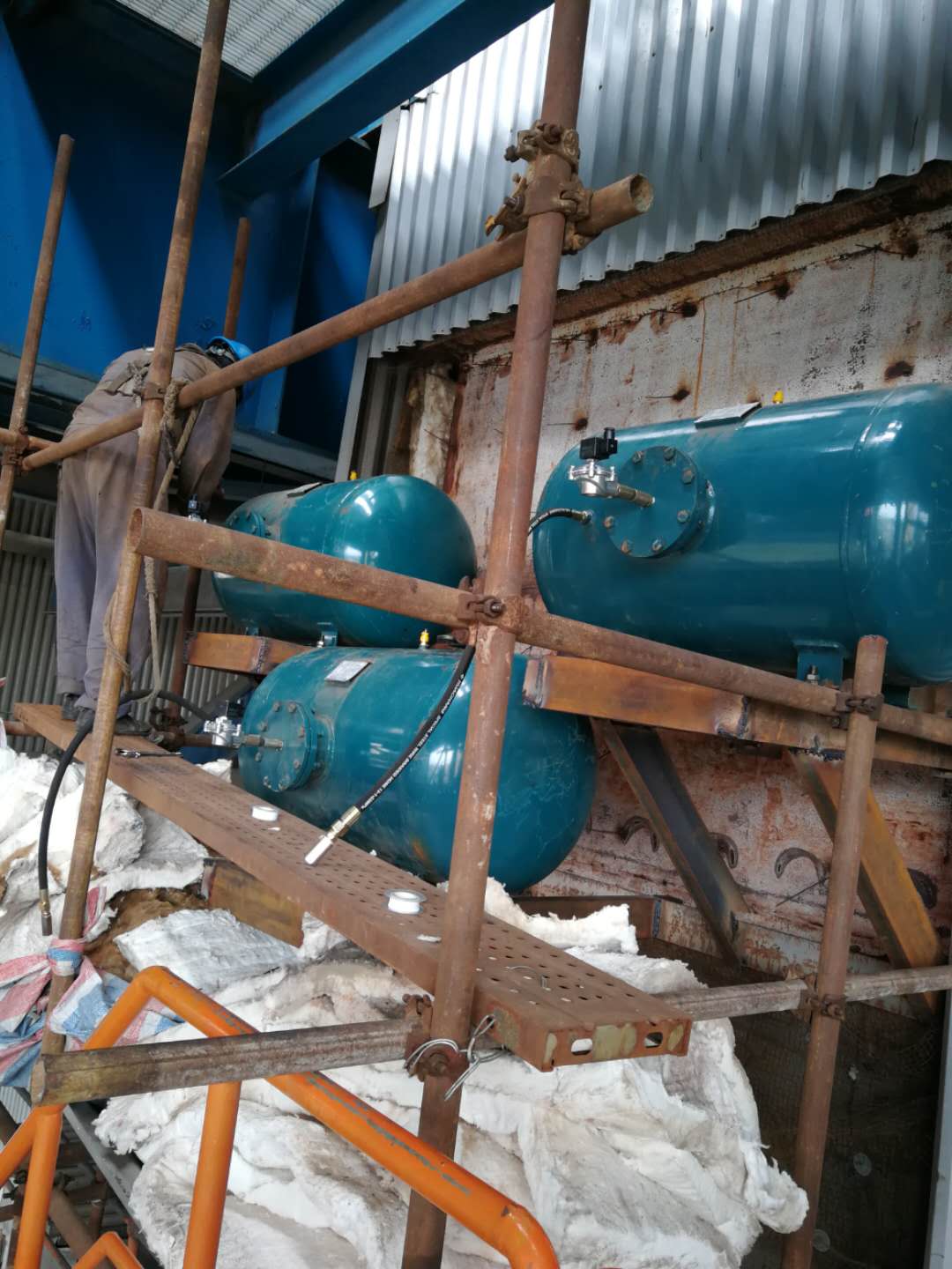 瀘州電廠脫硫改造項(xiàng)目設(shè)計(jì)空氣炮型號為KQP-B-300L,數(shù)量96臺,噴嘴口徑為108耐高溫鑄造鴨嘴形噴嘴,配置控制箱為自動不銹鋼雙開門,配套單向閥,油水過濾器。我公司與河南翔龍工程集團(tuán)有限公司(空氣炮安裝),受現(xiàn)場空間限制空氣炮噴管加長5米到6米左右。安裝完成后現(xiàn)場調(diào)試一次驗(yàn)收合格。